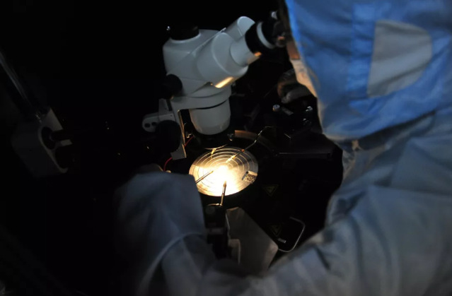 实验人员在检测台上对元器件进行检测