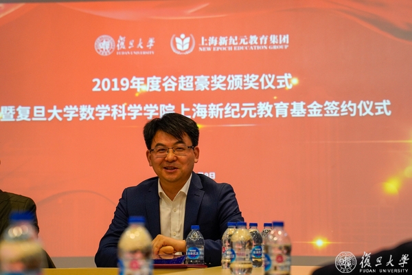 1月9日下午,2019年度谷超豪奖颁奖仪式暨“复旦大学数学科学学院上海新纪元教育基金”签约仪式在光华楼东辅楼101室举行。全国政协常委、民革中央副主席、上海市人大常委会副主任、民革上海市委主委高小玫,民革中央委员、民革上海市委会副主委、全国政协委员、上海市政协常委王光贤,复旦大学常务副校长、中国科学院院士金力,中国科学院院士李大潜、洪家兴、陈恕行,上海新纪元教育集团董事长陈伟志,浙江省人民政府驻上海办事处副主任章春华,温州市政府驻上海联络处徐珅隆,历届“谷超豪奖”获奖者,复旦大学对外联络与发展处负责同志,数学科学学院党政领导班子成员、教师及学生代表出席参加活动。