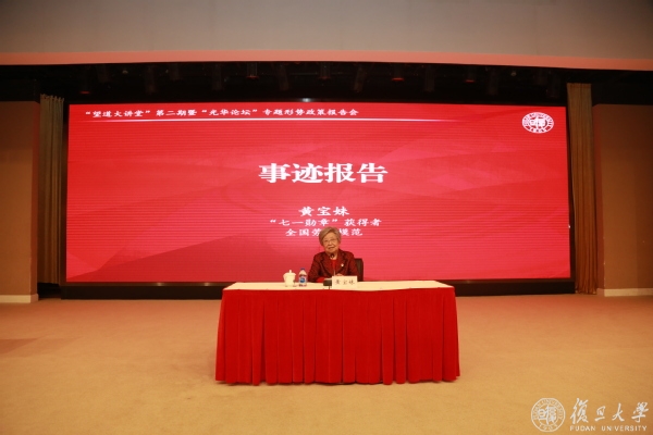 本次活动为“望道大讲堂”第二期,也是一堂“光华论坛”专题形势政策报告会。活动开始前,校党委书记焦扬会见了黄宝妹,代表复旦大学向这位“七一勋章”获得者致以崇高敬意,并对她莅临“望道大讲堂”表示热烈欢迎与衷心感谢,指出复旦大学将以此活动为契机,引导广大青年深入学习功勋模范党员先进事迹,努力继承发扬“劳模精神”,砥砺前行,奋发有为,在新征程中作出无愧于时代的贡献。校党委副书记许征出席活动。