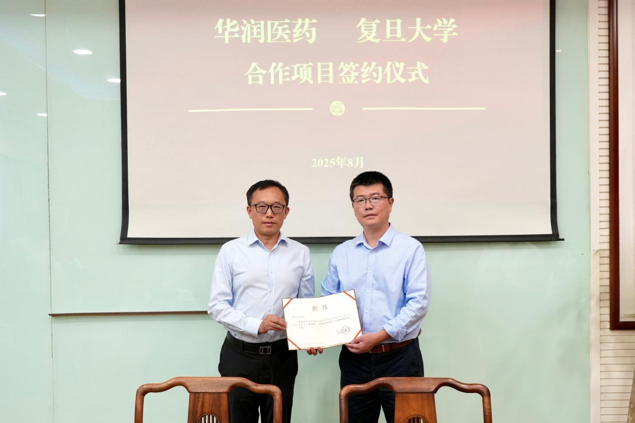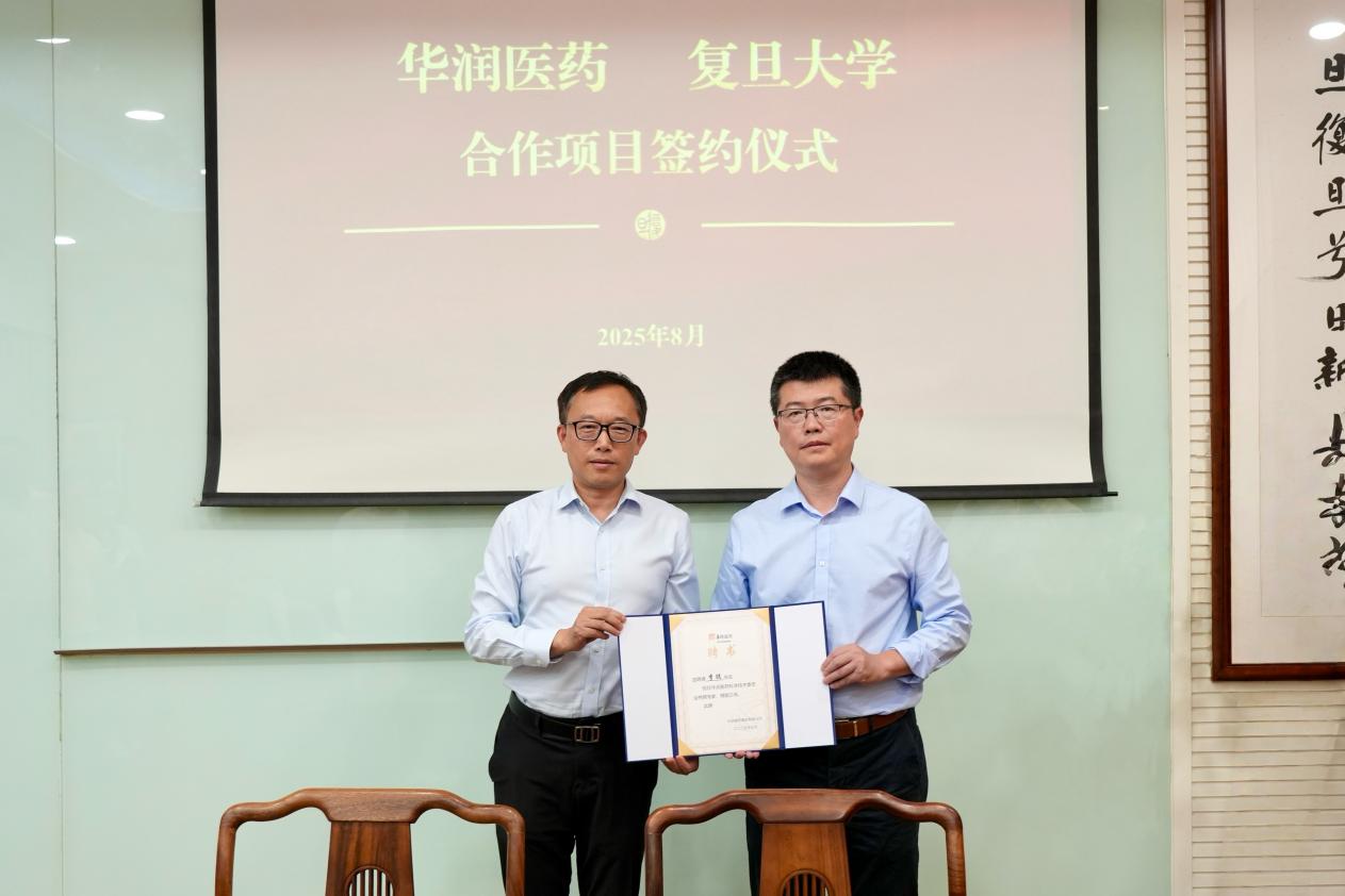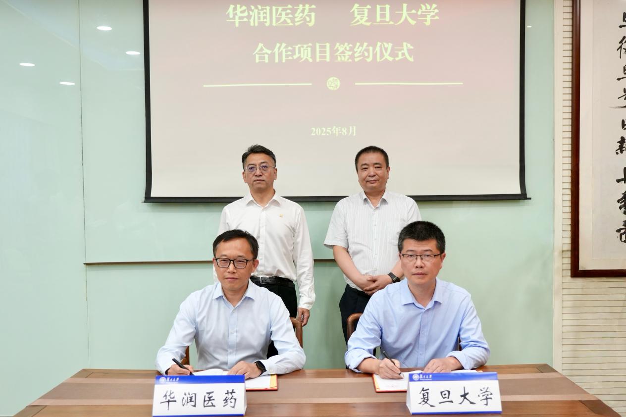 复旦大学校长金力,华润医药董事会主席白晓松见证签约。复旦大学药学院院长李聪、华润医药首席科学家陈波代表双方签约。