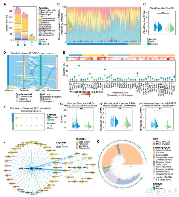 图2:哺乳动物携带的重要ARG的多样性和可转移性