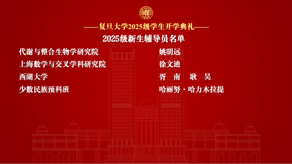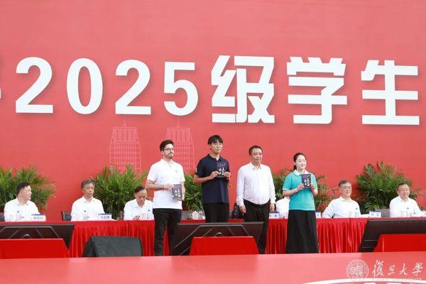 金力向2025级新生代表赠送校徽和复旦“文化校历”。新生们拿到的《文化校历》新增“我们的沃土”板块,集中呈现校内周期性活动,拥住所有的好奇与向往,等待同学们去自由探索。
