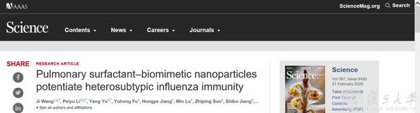 2020年2月21日,复旦大学基础医学院陆路、姜世勃团队联合哈佛医学院麻省总医院Mei X Wu副教授合作研究成果以Research Article的形式登上《科学》(Science)杂志主刊。论文题为《肺泡活性物质仿生纳米颗粒(PS-GAMP)增强抵御异型流感病毒感染》(“Pulmonary surfactant–biomimetic nanoparticles potentiate heterosubtypic influenza immunity”),揭示了仿生纳米颗粒作为通用流感疫苗粘膜佐剂的作用和机制。