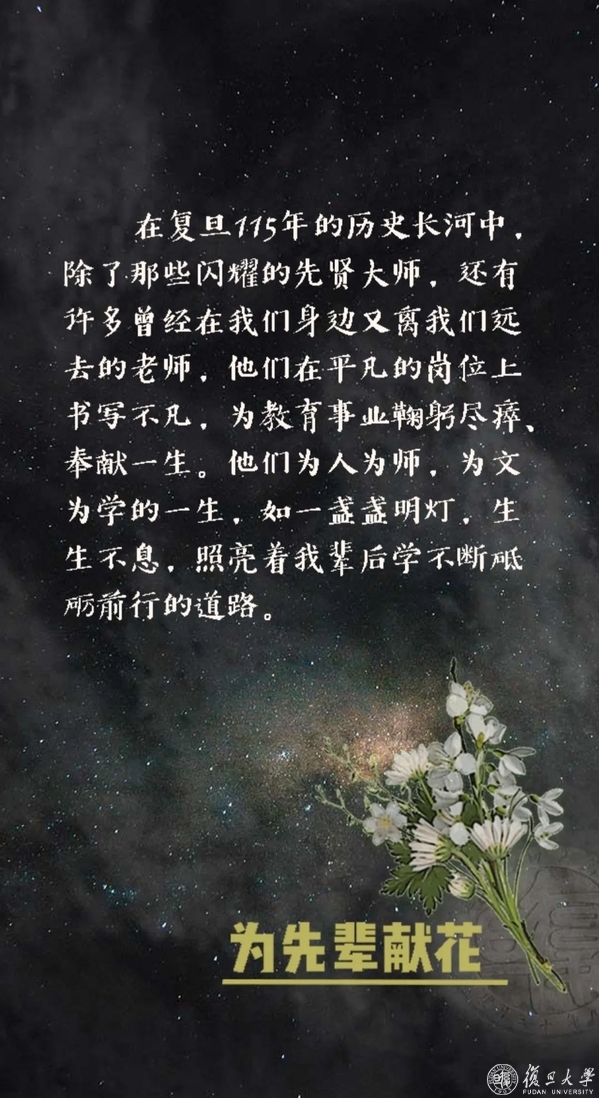 他们是复旦天空中的璀璨恒星。时代变迁,世事变幻,他们的故事经岁月沉淀而常读常新,他们的精神经坎坷淬炼而历久弥坚,他们及万千复旦人与家国同行的脚步已凝结为我们共同的基因代代传承,更在当下焕发铸魂育人的强大力量。