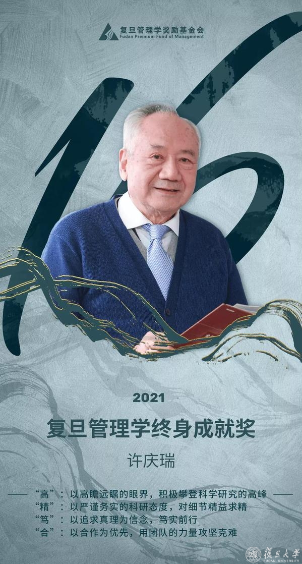 “复旦管理学终身成就奖”获奖人许庆瑞是我国率先开展技术创新管理研究的学者,在国内最早提出“企业必须成为技术创新的主体”。通过深入企业调研,结合时代发展趋势,许庆瑞先后提出了“二次创新”“组合创新”“全面创新”理论,形成具有中国特色的技术创新管理理论体系。他还曾以技术创新管理为切入点,关注可持续发展、经营管理、教育管理等种种议题。许庆瑞带领团队从中国企业的真实管理实践中孕育理论,曾深入杭州制氧机厂调查研究,帮助解决该企业工艺创新严重落后于产品创新的问题;常驻海尔内部调研10年,帮助海尔建立起全面创新管理体系,并搭建技术创新平台。许庆瑞高度关注中国管理学科建设和人才培养,推动建立浙江大学“工业管理工程”学科及“技术创新管理”专业,汇集中国第一批技术创新管理人才;较早提出了应培养“T型”的工程管理学人才,以“高精笃合”的理念建起中国技术创新管理队伍,构建了创新管理教育与创新型人才培育体系。