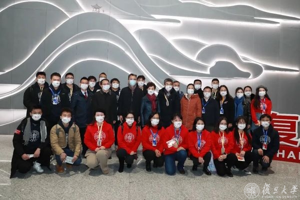 焦扬向“第一批复旦乘客”赠送复旦大学定制交通卡,并合影留念。常务副校长许征、副校长汪源源陪同慰问。