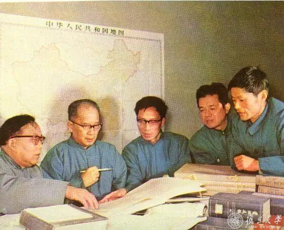 1970年代后期,谭其骧与研究室同事研究中国历史地理,自左向右分别是吴应寿、谭其骧、邹逸麟、王文楚、周维衍。