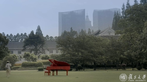 一如往常的复旦校园里,出现了一架不同寻常的红色钢琴。