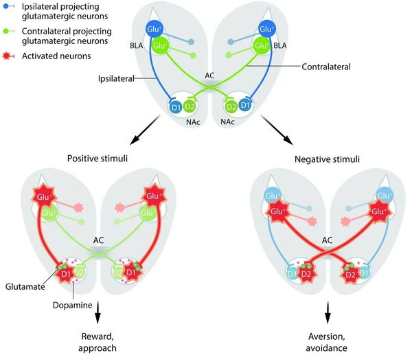 进一步的研究表明,BLA到同侧半球NAc的神经投射主要支配D1型神经元,增加在NAc的多巴胺释放,促进正性奖赏情绪的形成;而BLA至对侧半球NAc的神经投射主要支配D2型神经元,降低NAc的多巴胺水平,而导致负性厌恶情绪和相关记忆的形成。