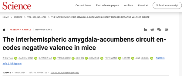 复旦大学基础医学院、脑科学研究院、脑功能与脑疾病全国重点实验室刘星教授、马兰教授合作研究发现,小鼠脑内基底外侧杏仁核(BLA)神经元,通过连接左右两侧脑半球的前连合(Anterior Commissure,AC)投射到对侧脑半球的伏隔核(NAc),这一跨脑半球神经环路与同侧神经环路的功能相反,介导恐惧、厌恶类负性情绪及逃避行为的产生。2024年11月8日,这一重要发现以《杏仁核至对侧脑半球伏隔核神经环路编码负性情绪效价》(“The interhemispheric amygdala-accumbens circuit encodes negative valence in mice”)为题发表在《科学》(Science)杂志上。