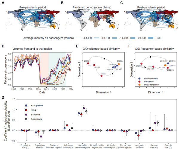 全球航空流量变化及在流感传播中的作用(A-C:不同时期的区域间航空流量;D:各区域相对出入航空流量;E-F:不同时期航空流量绝对值和模式分布;G:流感传播驱动因素)