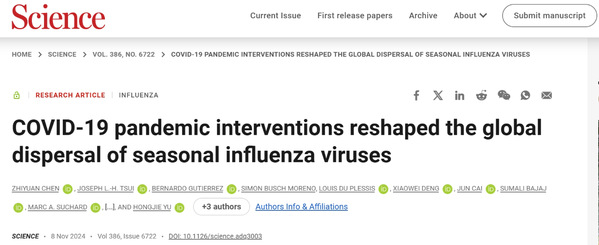 复旦大学公共卫生学院余宏杰教授团队与国际顶尖系统进化研究团队合作研究,发现了COVID-19大流行前中后季节性流感的全球时空传播动态及驱动机制,为制定流感全球防控措施提供了重要依据。相关成果以“COVID-19 pandemic interventions reshaped the global dispersal of seasonal influenza viruses”为题,于北京时间2024年11月8日在《科学》(Science)杂志发表。