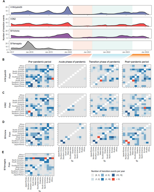 研究进一步聚焦在重建大流行前期(2017年1月-2020年3月)、大流行期的急性阶段(2020年4月-2021年3月)、大流行期的转变阶段(2021年4月-2023年4月)和大流行后期(2023年5月-2024年3月)四个阶段的全球季节性流感传播动态。