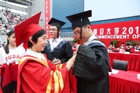 母校也为毕业生们准备了礼物“相辉校友章”,焦扬为毕业生代表佩戴徽章。今年,毕业生们还收到一份特殊的毕业礼物:一套精致的复旦校训藏书章。“博学笃志,切问近思。”母校的期许于方寸间寄托,愿毕业生们不忘校训,时刻谨记读书学习,不废不止。即将成为19届年轻校友的毕业生们正带着复旦人的烙印,奔向属于他们的灿烂前程。