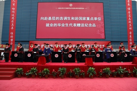 校党委副书记尹冬梅宣读了2019届上海市优秀毕业生名单。长期以来,复旦大学号召毕业生把个人发展和国家、社会和人民需要结合起来,在实现民族伟大复兴“中国梦”的进程中,实现个人价值。校领导和导师代表向奔赴基层、西部和国家重点单位就业的毕业生代表赠送了纪念品,祝愿他们带着理想与使命,到祖国和人民最需要他们的岗位上建功立业。