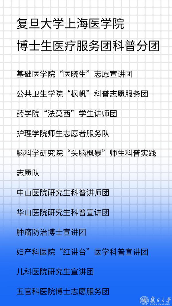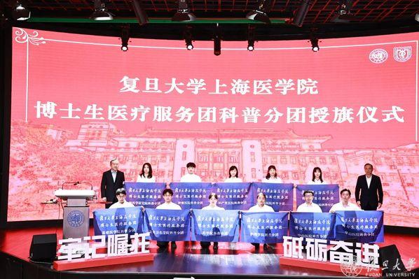 会上,校党委副书记、上海医学院党委书记袁正宏,校党委常委、上海医学院党委副书记、副院长徐军为复旦大学上海医学院11个博医团科普分团授旗。(详见制图)