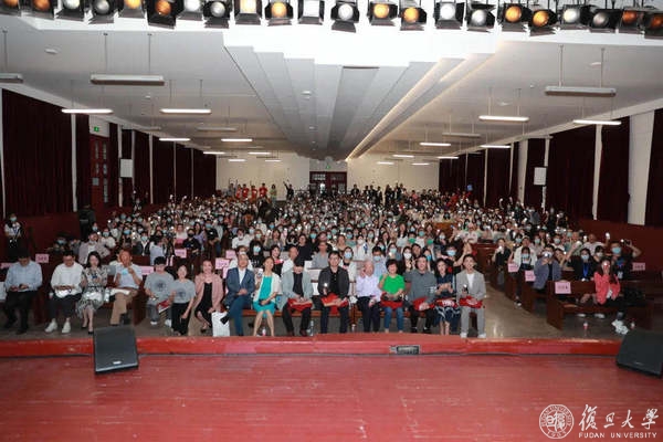 活动最后,复旦大学新闻学院新韵合唱团,复旦大学校友会蓝精灵合唱团演唱《我和我的祖国》以及复旦大学校歌,用歌唱的方式庆祝建党百年。复旦师生代表与主创团队互赠礼品并与全场观众合影留念。
