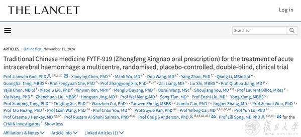 据悉,该研究是中药在脑出血治疗领域中规模最大的随机对照临床试验。复旦大学类脑智能科学与技术研究院宋莉莉教授、克雷格·安德森(Craig Anderson)教授团队,以及广东省中医院郭建文教授团队共同完成了此次研究。郭建文、武曼丽、王豆和乔治全球健康研究院陈晓英、赵洋为该研究的共同第一作者,宋莉莉、克雷格· 安德森和郭建文为共同通讯作者。