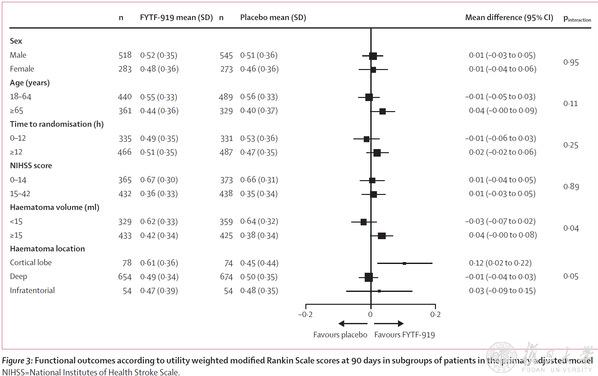 研究结果显示,试验组和安慰剂组在90天UW-mRS的平均值上所差无几,各项敏感性分析结果均一致,在亚组分析上,治疗效果在血肿体积和血肿位置方面展现出了显著异质性。