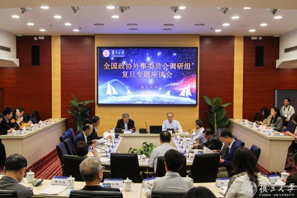 5月13日下午,全国政协外事委员会副主任孔泉率专题调研组一行14人来访复旦大学,围绕“加强国别问题基础研究”进行专题调研,上海市政协、市教委相关负责同志陪同。复旦大学党委书记焦扬会见调研组一行。复旦大学副校长陈志敏主持调研座谈会,国际问题研究院、发展研究院、一带一路及全球治理研究院、中外人文交流研究中心、国际合作与交流处等单位负责人及多位知名专家学者参加会议。