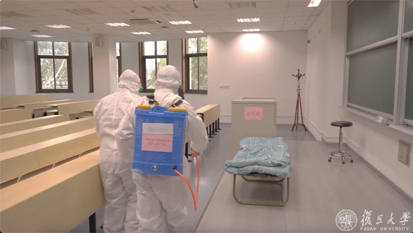学院关上大楼大门,防疫人员赶到现场。总务处派消杀人员赶赴微电子楼和第二教学楼临时隔离点进行环境消杀。