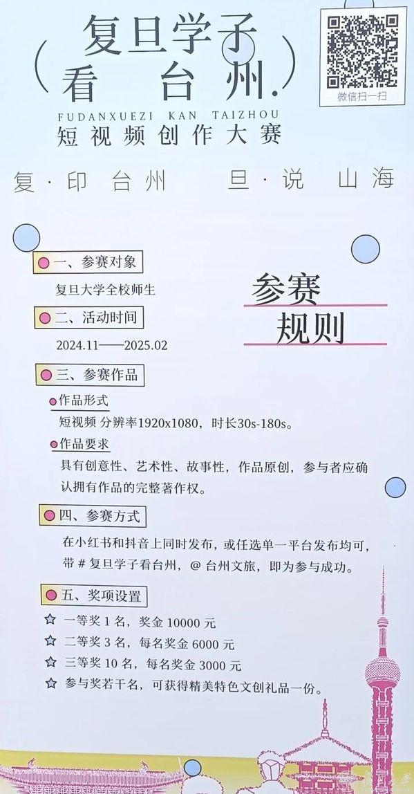 “复旦学子看台州”短视频创作大赛等你参与。期待用复旦学子视角展现台州城市魅力,同时为复旦学子提供更广阔的社会实践和创作平台。