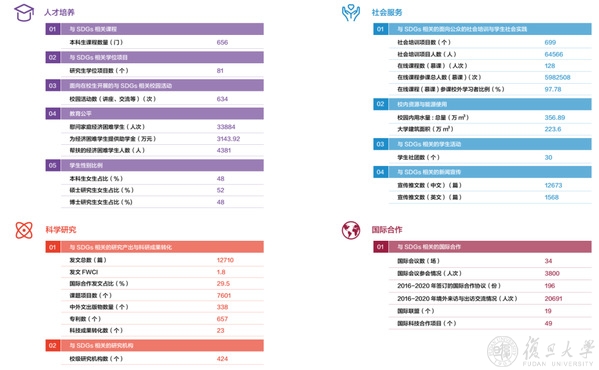 以“国家意识、人文情怀、科学精神、专业素养、国际视野”为育人目标,以“潜心教育、人心向学、脚踏实地、追求卓越”为理念,复旦大学致力于发挥综合性研究型大学优势,坚持以立德树人为根本,厚植师生成长沃土,也为人类社会的可持续发展源源不断培育人才。2020-2021学年,全校共开展与SDGs相关的本科生课程656门,研究生学位项目数81个,举办634场与SDGs相关的校内学生活动。