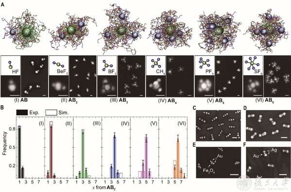 图3. 几种典型的纳米“人造分子”。(A)计算机模拟分子构型和相应扫描电子显微镜照片。 (B)产率统计分布。(C-F)不同大小纳米粒子(C、D)及不同组分纳米粒子(E、F)形成的AB2型 “人造分子”。标尺为50纳米(A)和100纳米(C-F)。