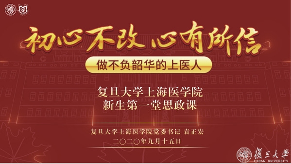 “今年是中国共产党成立99周年,在‘七一’前夕,习近平总书记给复旦大学《共产党宣言》展示馆党员志愿服务队全体同志回信。在回信中,习近平总书记用‘心有所信,方能行远’为青年党员指明前行的方向,这是总书记对全体复旦学子寄予的殷切希望。所以,在今天上海医学院新生的第一堂思政课上,我把题目定为‘初心不改,心有所信,做不负韶华的上医人’。”思政课一开始,袁正宏开宗明义,表示希望带领新生们走近上医的建立初心,回顾上海医学院跨越93年的不凡历程,了解复旦上医的最新发展,感受复旦上医的精神和文化。