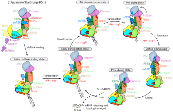 此前的研究报道了Dicer-2蛋白结合底物时就会有明显的构象变化,加之ATP依赖的Dicer-2蛋白在siRNA加工过程中需要通过水解ATP来在双链RNA上移动,并且连续的切割过程势必也会导致存在处于不同状态的复合物,三者叠加势必对复合物的均一性造成较大的影响。对此,研究团队从活性位点突变的单独蛋白复合物结构开始解析;之后加入了双链RNA,获得了无ATP时,处在初始结合状态的Dicer-2–Loqs-PD–dsRNA复合物高分辨结构;在此基础上,进一步加入ATP,通过数据收集与计算分类,得到了切割活性状态与两种明显具有不同结构特点的移位状态(早起移位与中期移位状态);然后使用正常活性的Dicer-2蛋白,获得了处于切割后状态的复合物,并通过分析发现它正向早起移位状态转变;从而将整个过程串起,阐明了Dicer-2–Loqs-PD复合物从结合双链RNA并在其上移动,到形成切割活性状态,直至切割完成产生siRNA的整个循环过程的分子机制和其中连续且递进的构象变化。