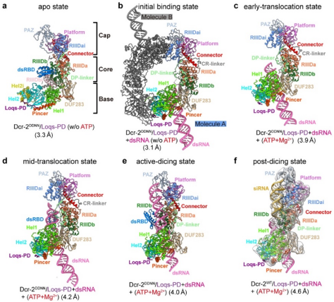 图1. Dicer-2–Loqs-PD结合双链RNA复合物在不同状态下的冷冻电镜结构。