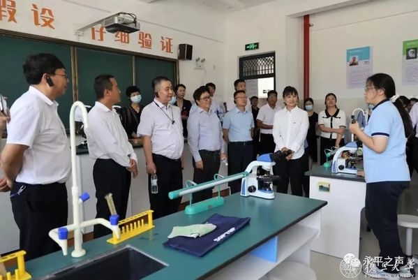 在永平一中,金力一行先后参观校史馆、阅览中心、生物实验室、体育场。近年来,学校整合基础教育集团下复旦大学附属中学、第二附属学校等资源,帮助永平一中改善教学设施,充实师资队伍,改革教学方法,提升办学水平。在刘振鹏校董的关心下,支持青岛科文集团组织举办“永平一中振兴班”,帮助实施教育改革试点,力争全面提升永平一中的教育教学水平和学生的综合素质。