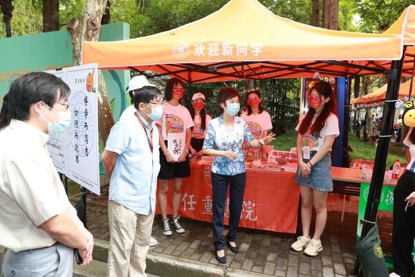 校园内,五大书院的五色风车和彩旗迎风招展,印有学生设计的老校长卡通形象的道旗讲述着“希与卿度,任志腾飞”的百年故事。焦扬一行来到任重书院中庭,橙色的背景板和可爱的书院萌宠映入眼帘,任重书院院长、复旦大学中文系教授陈尚君正和报到咨询台的志愿者一起迎新生。陈尚君每年都来迎接新生,与新生交流、合影,今年也不例外。