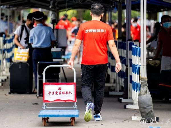 身穿背后印有“学生党员服务队”、“欢迎新同学”的红上衣,学生迎新志愿者们站在正门迎新导引牌四周,随时为新生和家长解答问题,指引方向。