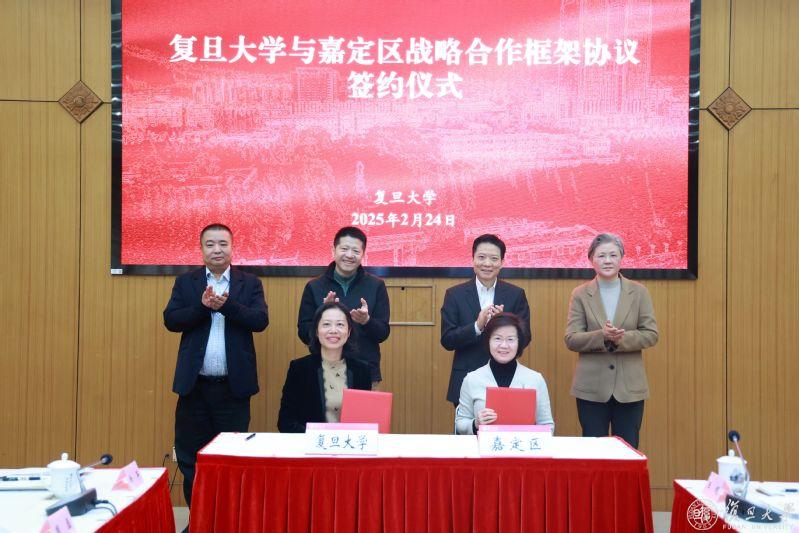 在复旦大学党委书记裘新,校长、中国科学院院士金力,嘉定区委书记陆方舟,区委副书记、区长高香共同见证下,复旦大学常务副校长许征,嘉定区委常委、常务副区长陆祖芳代表双方签约。
