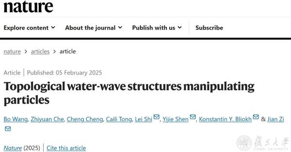 2月6日,物理学系资剑教授、石磊教授团队联合河南大学、新加坡南洋理工大学、西班牙圣赛瓦斯蒂安国际理论物理中心等研究机构,在《自然》(Nature)发表题为“Topological water-wave structures manipulating particles”的研究成果。在简单的三波干涉场中,团队成功生成了多种拓扑水波结构,包括位移场中的相位涡旋、Skyrmion晶格、自旋密度场中的Meron晶格、局部水面粒子的圆偏振奇点以及莫比乌斯环等,利用液体表面波相控阵技术干涉构造不同阶的贝塞尔型水波涡旋场,观测到了位移场高阶相位涡旋以及嵌套斯格明子。团队自主开发了一套先进的液体表面波实验观测平台,以及针对液体表面波任意调控的相控阵技术,首次实现了包括基于液体表面波梯度力的亚波长粒子捕获,由局部波动动量驱动的粒子推进与轨道运动,由局部自旋密度引发的粒子自旋运动等。此次研究突破使水波成为探索拓扑物理的全新平台,不仅深化了人们对经典重力波系统中的矢量特性理解,揭示了其中自旋轨道耦合和锁定机制,也开辟了水波力操控物体运动的研究领域。