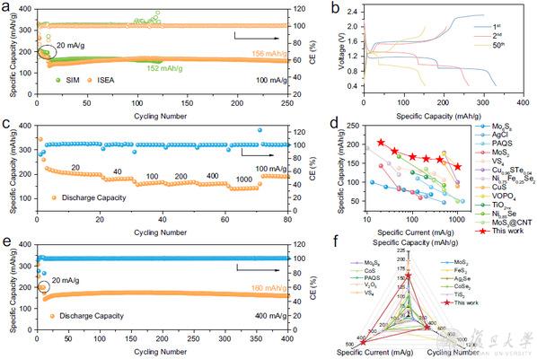 2月22日,材料科学系孙大林、王飞、刘洋课题组提出原位电化学活化(ISEA)策略,显著提高了CuSe正极材料的储镁动力学,实现了RMBs优异的循环稳定性和倍率性能。相关成果以“In-situ electrochemical activation accelerates the magnesium-ion storage”为题发表在Nature Communications期刊上。ISEA策略通过优化正极材料的表面组成和晶格结构,促进了镁离子的传输和反应动力学。具体而言,经过ISEA处理后的CuSe正极表面富含MgF2,根据先前的报道,该成分有利于加速镁离子在电极和电解液之间的传输,提高储镁动力学;此外通过ISEA处理后,还扩大了CuSe正极(100)晶面的晶面间距,结合DFT计算表明,晶面间距的缩小降低了吸附能和形成能,促进镁离子的吸附和反应从而改善储镁动力学。最终,活化后的CuSe/TFSI/Mg电池在高电流密度下展现出优异电化学性能,400次循环后仍能保持~160 mAh/g的比容量,容量保持率超91%。倍率性能测试中在1000 mA/g的高电流密度下,电池比容量高达141 mAh/g。这项研究为改善储镁动力学提供了新思路和新方法。